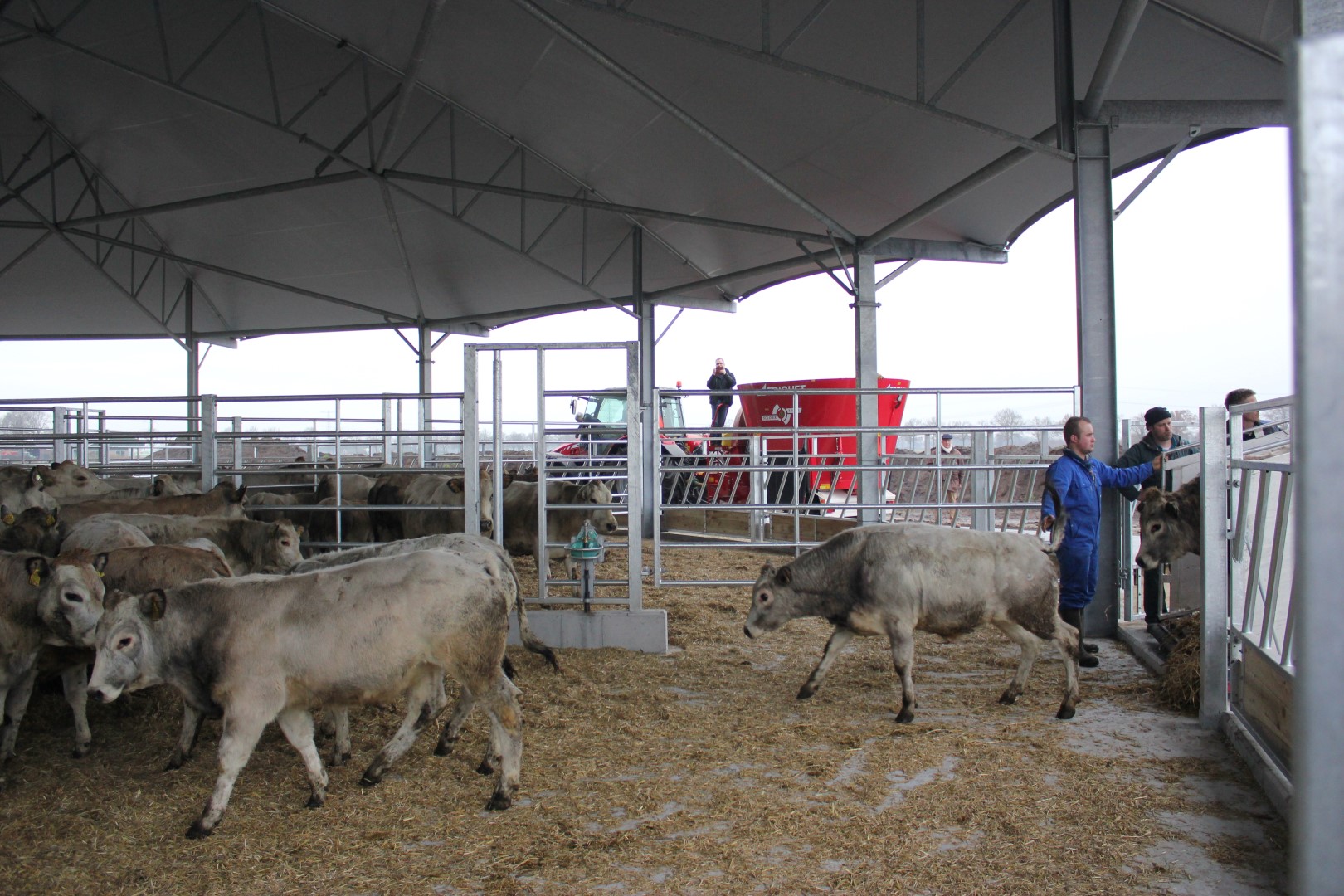 The Roundhouse building offers the breeder the great advantage of being able to easily move the animals from one pen to the other by using the integral crowd pen. A feature which was tested immediately by the proud new owner. Also the ease of feeding on the outside had to be tried. After which the animals could quitely start to get used to their new barn. Below you will find a video and photos of the first steps the cows took in their brand new shelter.
