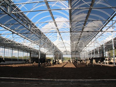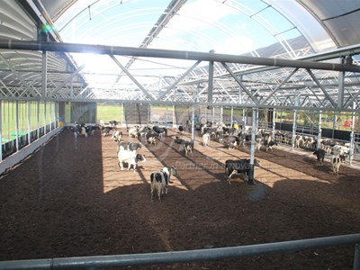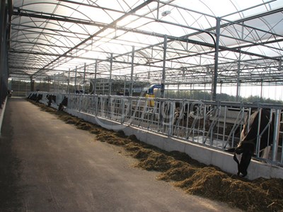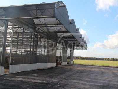 Apart from the excellent ventilation through the façades, this barn offers the possibillity to fully open the roof over the bedding. The roof rolls away like with a convertible, hence the name Cabrio. Opening the roof will take only 20 seconds. The roof is equipped with a rain sensor and if needed will close automatically. Two domes of the barn have been equipped with the Cabrio roof, the other domes have been provided with a semitranslucent roof cover, providing shade in the barn.