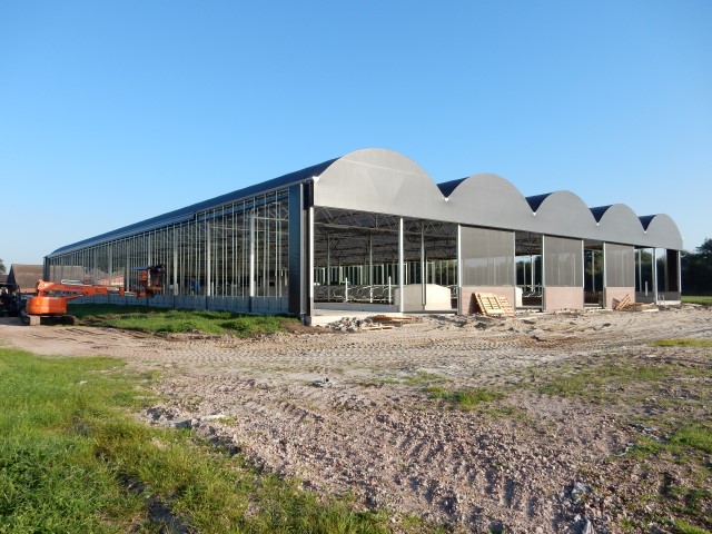 In Ostfriesland, a region in the northeast of Germany, the very first Cow Lounge of Germany has been taken into operation. Klaas Geerdes and his son Christian manage together their dairy farm Milchhof Geerdes. Their purpose for the new barn is to improve the animal welfare through more light and fresh air. The father and son have invested in a modern barn equipped with 3 milking robots for their 170 dairy cows. The building with its distinctive wave-shaped roof consist of a galvanised steel construction which measures 58 x 40 m and is covered by 5 domes. Cross ventilation is offered through 5,50 Meter high side walls that are fitted with curtains.